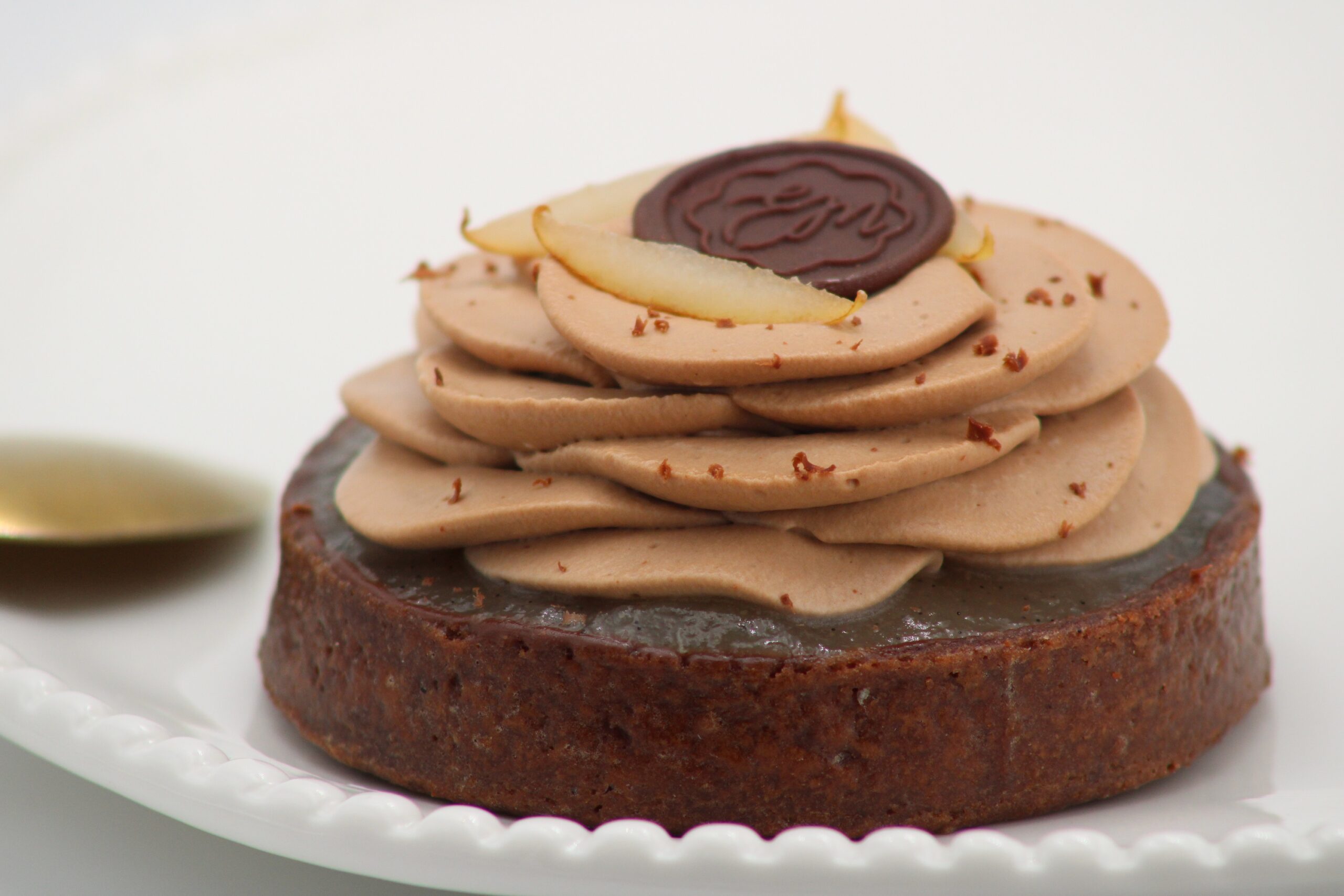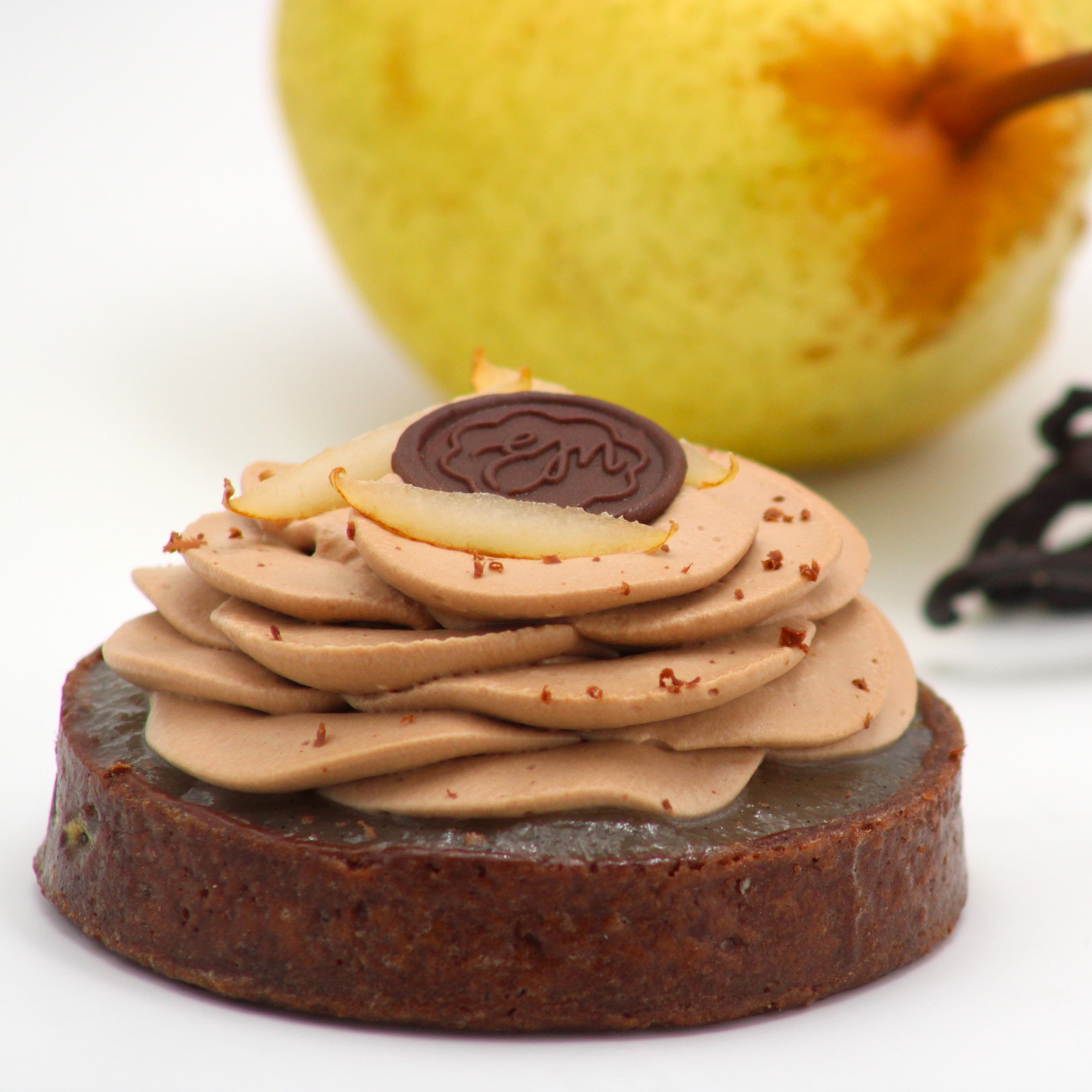 Pâte sucrée cacao, crémeux chocolat, compotée poire-vanille, ganache montée chocolat