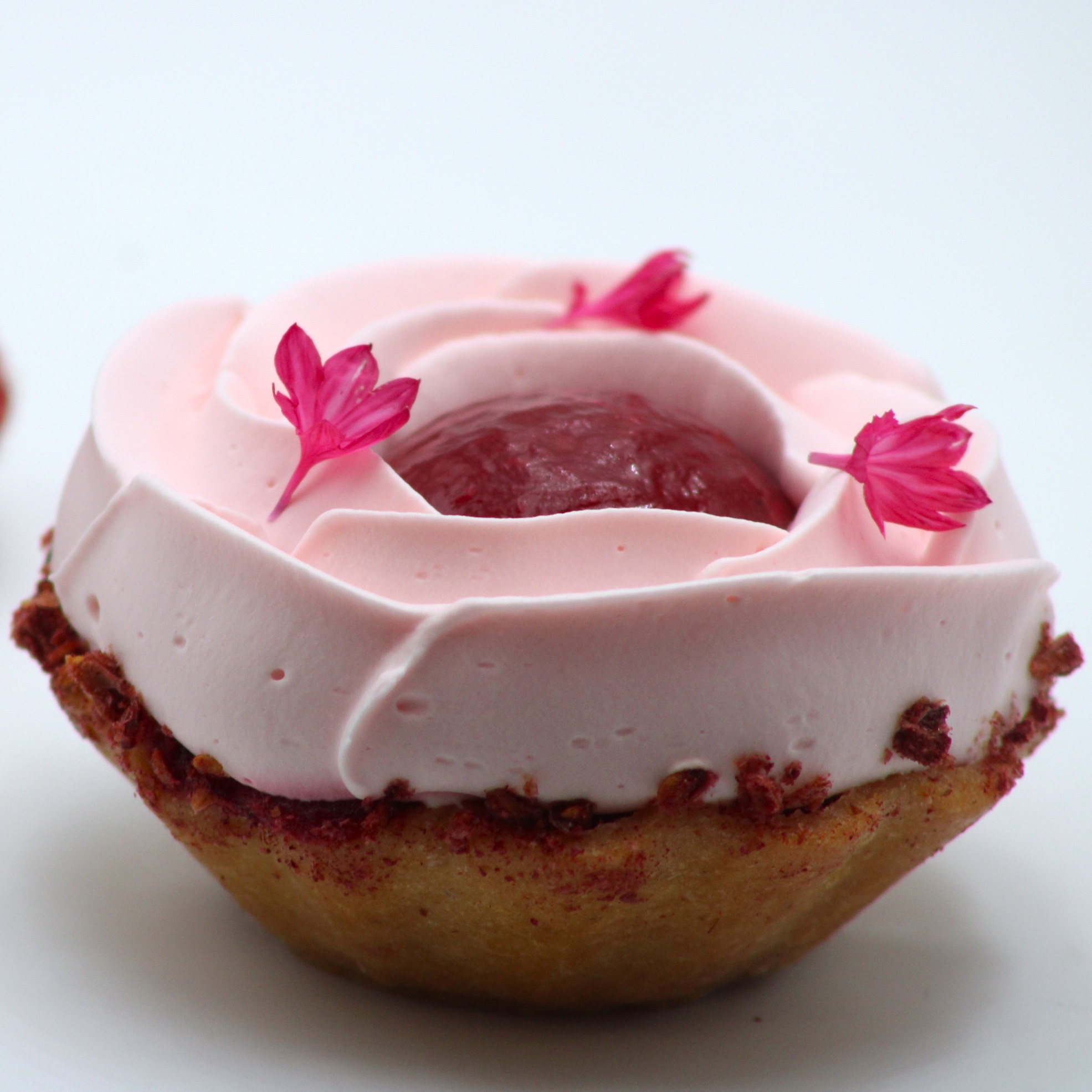 Pâte sucrée, croustillant, biscuit moelleux framboise, compotée de framboises, ganache montée à la rose
