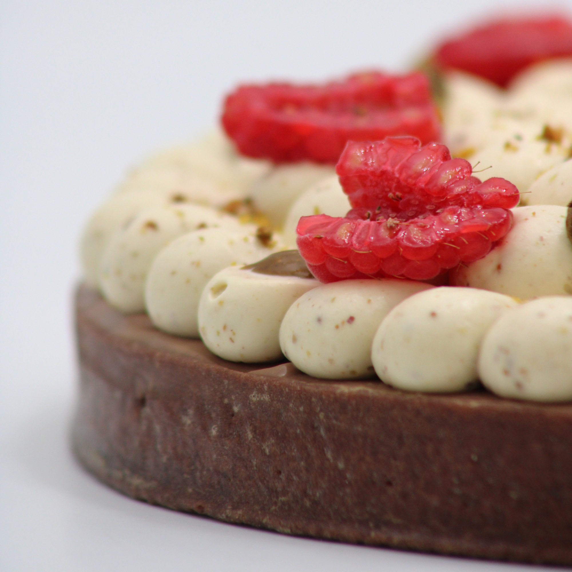 Pâte cacao, croustillant pistache, crémeux chocolat, compotée de framboises, ganache montée pistache