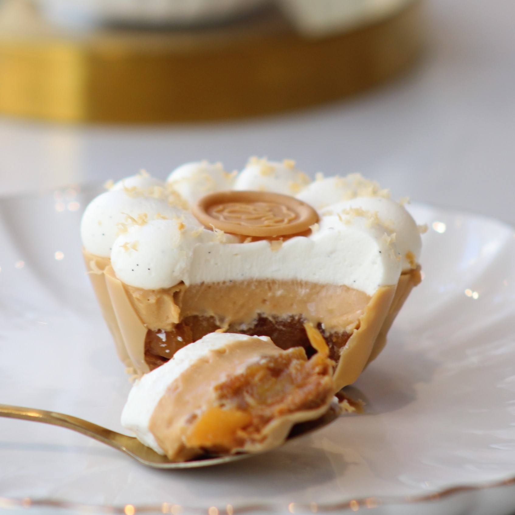 Croustillant spéculoos, pommes caramélisées, crème caramel, ganache montée vanille