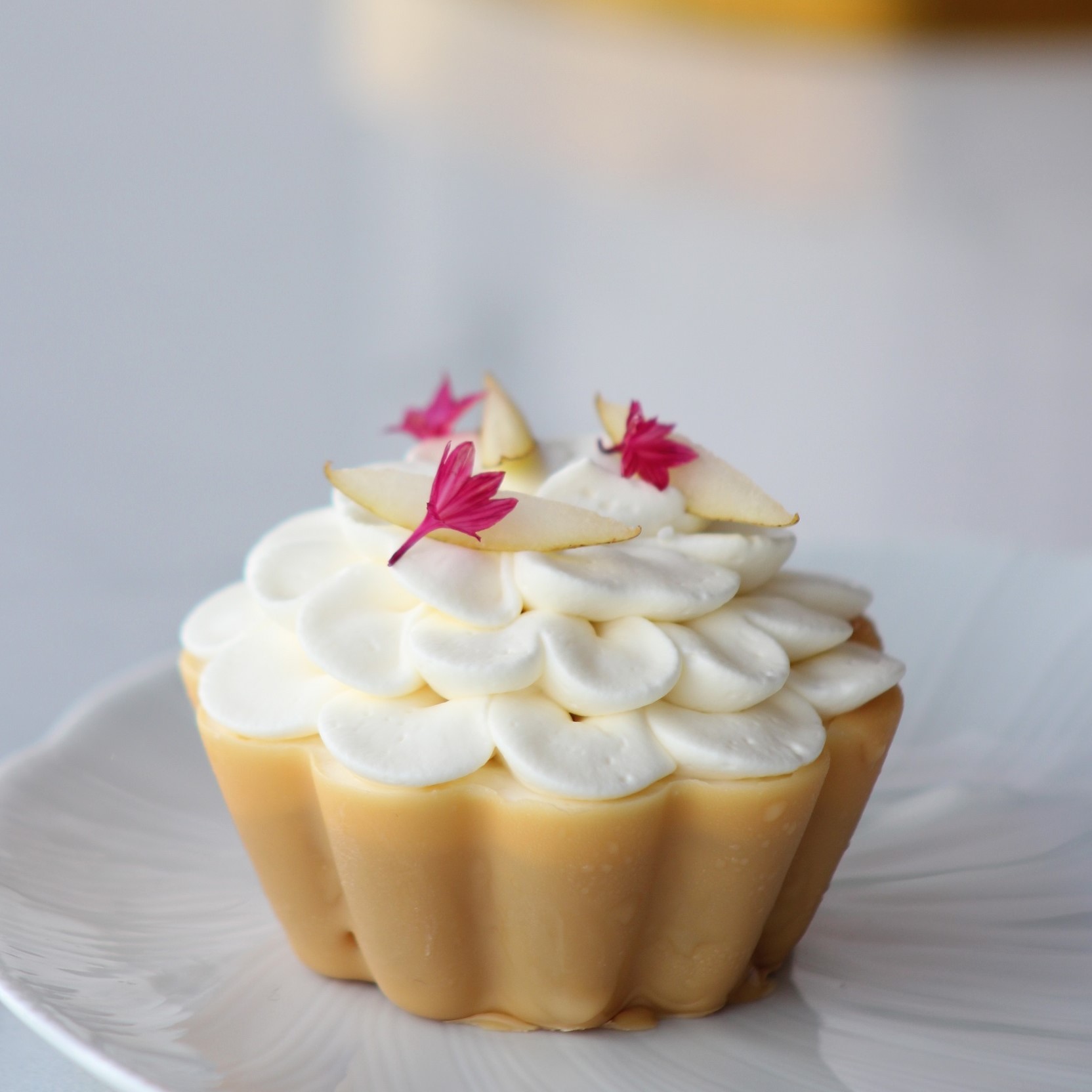 Biscuit moelleux amande, compotée poire-vanille, panna cotta jonchée bio, ganache montée à l’ amande amère